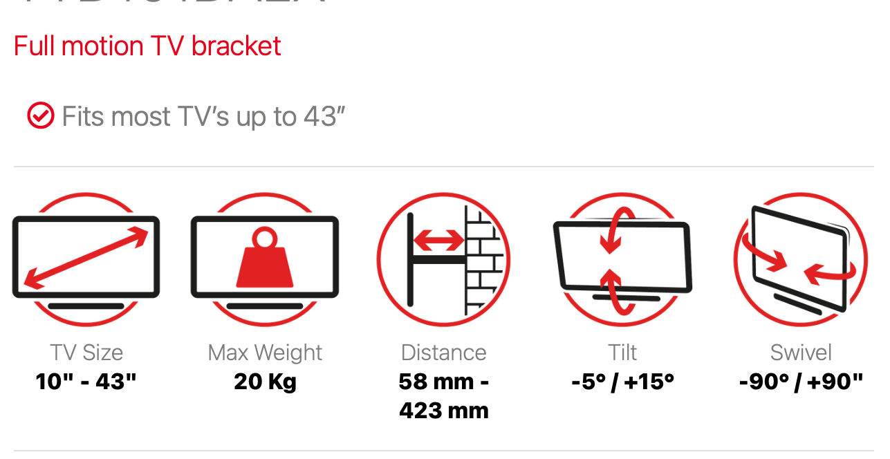 - Fits VESA sizes from 75 x 75 to 200 x 200 with extension arms